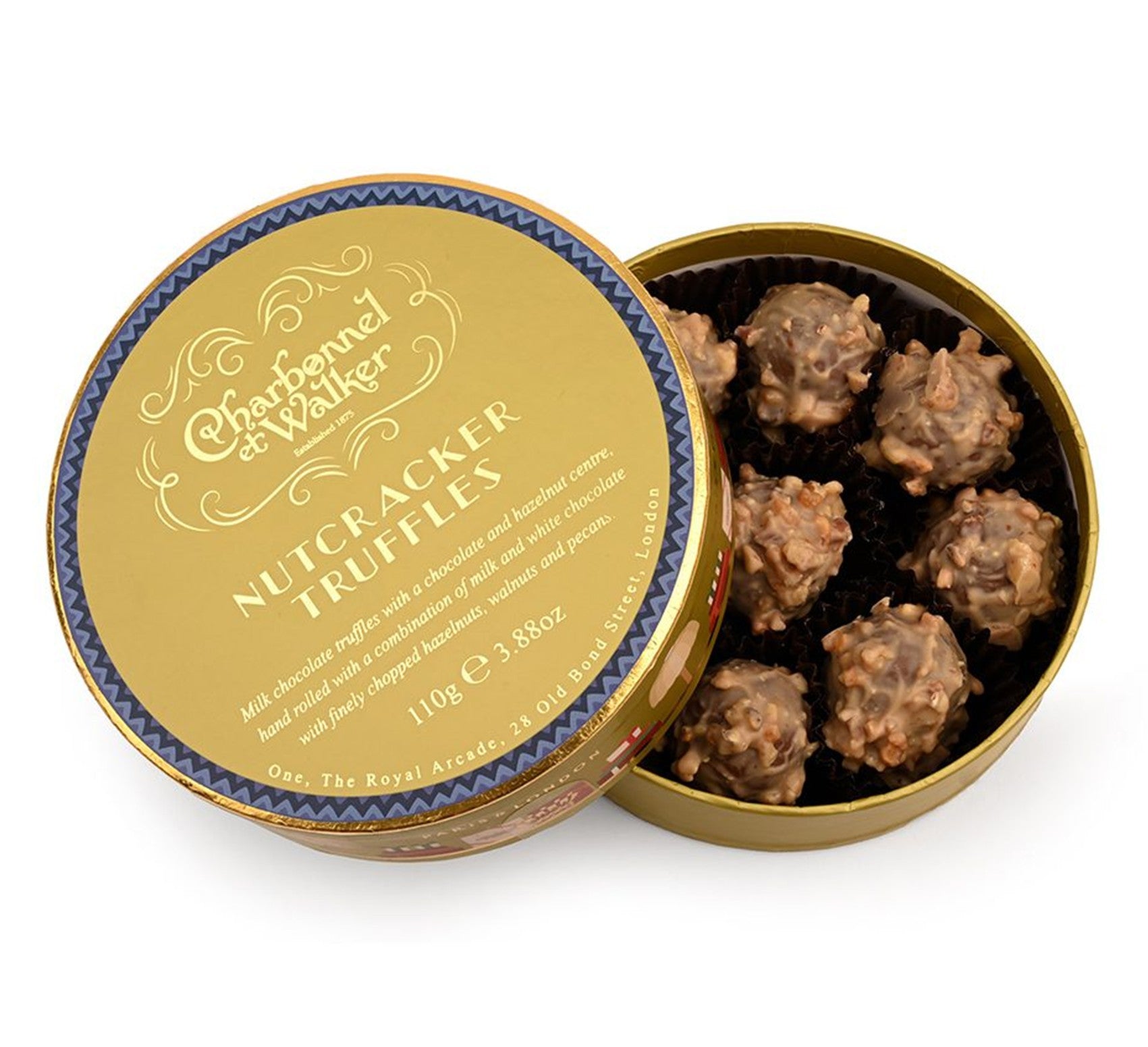 New this Christmas, the Nutcracker Truffle is a decadent White Chocolate Truffle with hazelnut centre, hand rolled in blonde chocolate with chopped hazelnuts, walnuts and pecans. Beautifully presented in a gold and blue gift box. The sides of the gift box decorated with illustrations from our 150 year celebrations. A remarkable journey of chocolate making history.