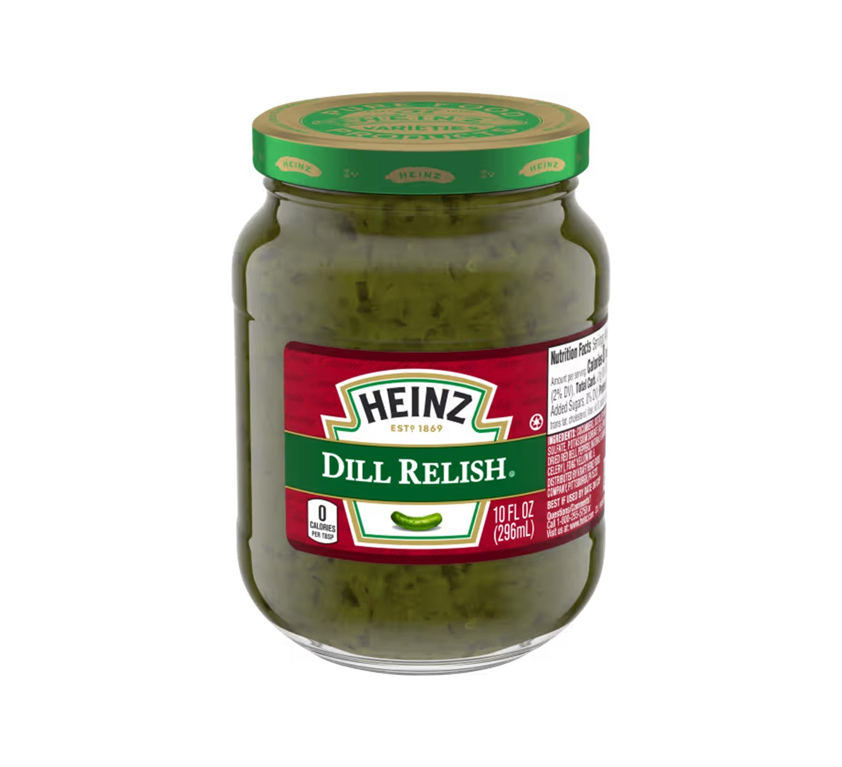 Featuring crunchy pickled cucumber and cabbage immersed in vinegar, Heinz Dill Relish will help you create flavors which complement any dish. With chunks of red bell pepper and extracts of garlic, this 12.7 fluid ounce bottle of Heinz Dill Relish will add a completely new dimension of flavors to your favorite dish. This relish is prepared with care so that every bottle has the perfect ratio of ingredients to complement your favorite foods. Just drizzle this relish on top of your food or use it as a dip and the crunch from cucumbers and cabbage will add life to any meal.